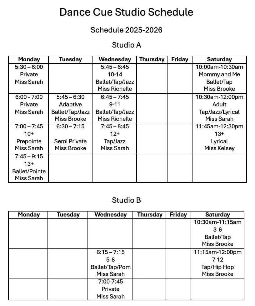 Contact kelsey@dancecuestudio.com for more information on pricing and what we can provide.